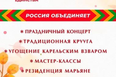 Мы подготовили большую развлекательную программу. Праздник начнется с крестного хода от собора Александра Невского. Его участники пройдут до площади Кирова, где и состоятся основные торжественные мероприятия.В 12:00 для жителей и гостей города солисты Музыкального театра Карелии и другие творческие коллективы выступят на концерте «Народов много – Родина одна!». Также в полдень на площади начнутся народные гуляния в рамках традиционного фестиваля «Марьяне». Исполним вместе общую круугу, наградим победителей конкурса «Лукошко для Марьяне», насладимся творческим показом уникальных платков из семейных коллекций…Песни, танцы, мастер-классы, спортивные соревнования для детей и взрослых – программа обширная. Приходите! Подробности – в закрепленном файле.»